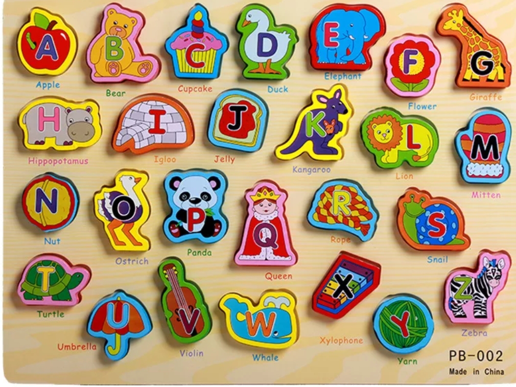 Board of letter shaped groove – painted with the words that begin with the letter and a corresponding animal picture.