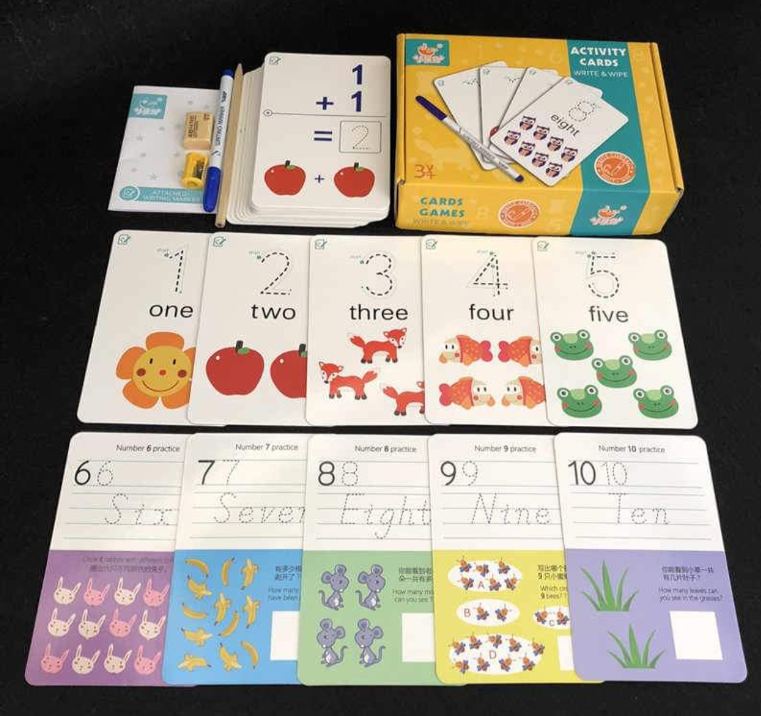 @Each pack contains 30 cards,1 Pencil,1 Sharpener, 1 marker, and 1 reusable wipe cloth.