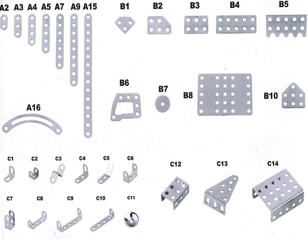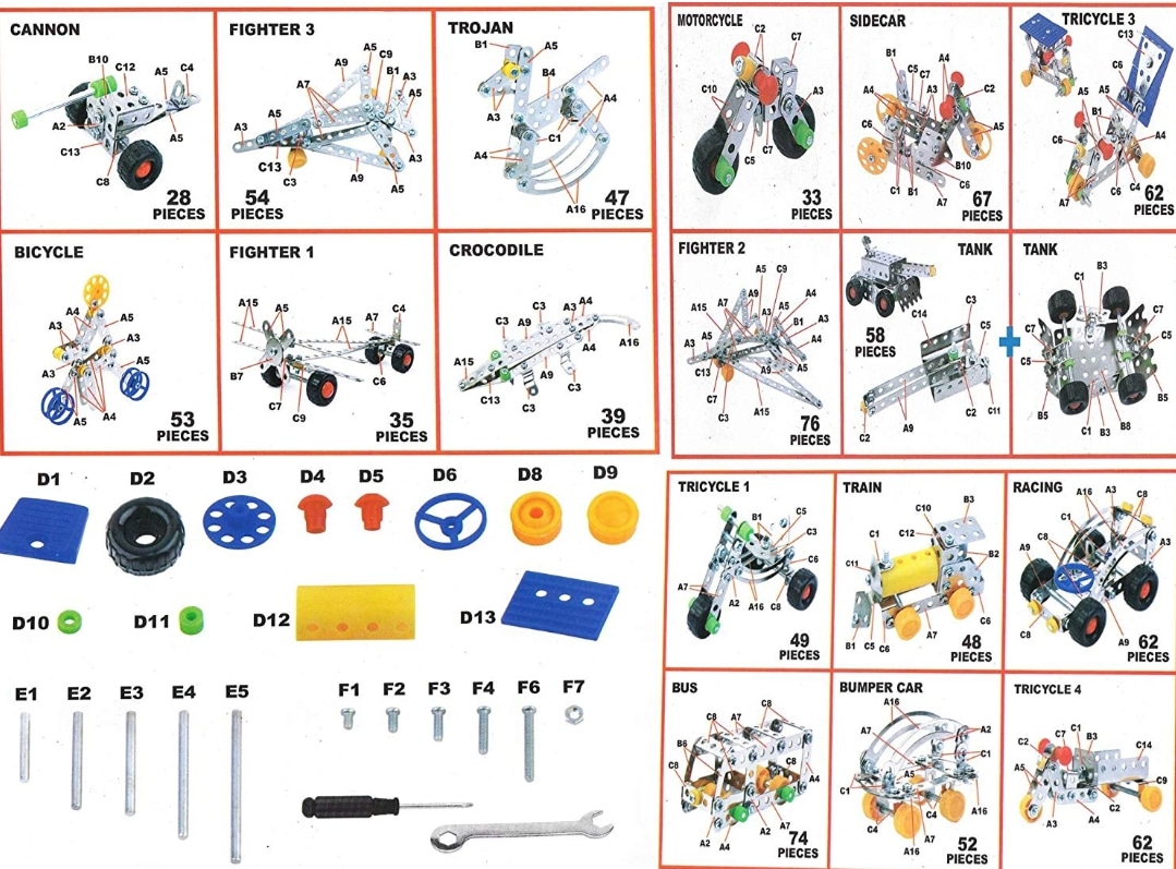 Pieces: Contains 239 pieces, including screws, wheels, bolts, and metal parts.