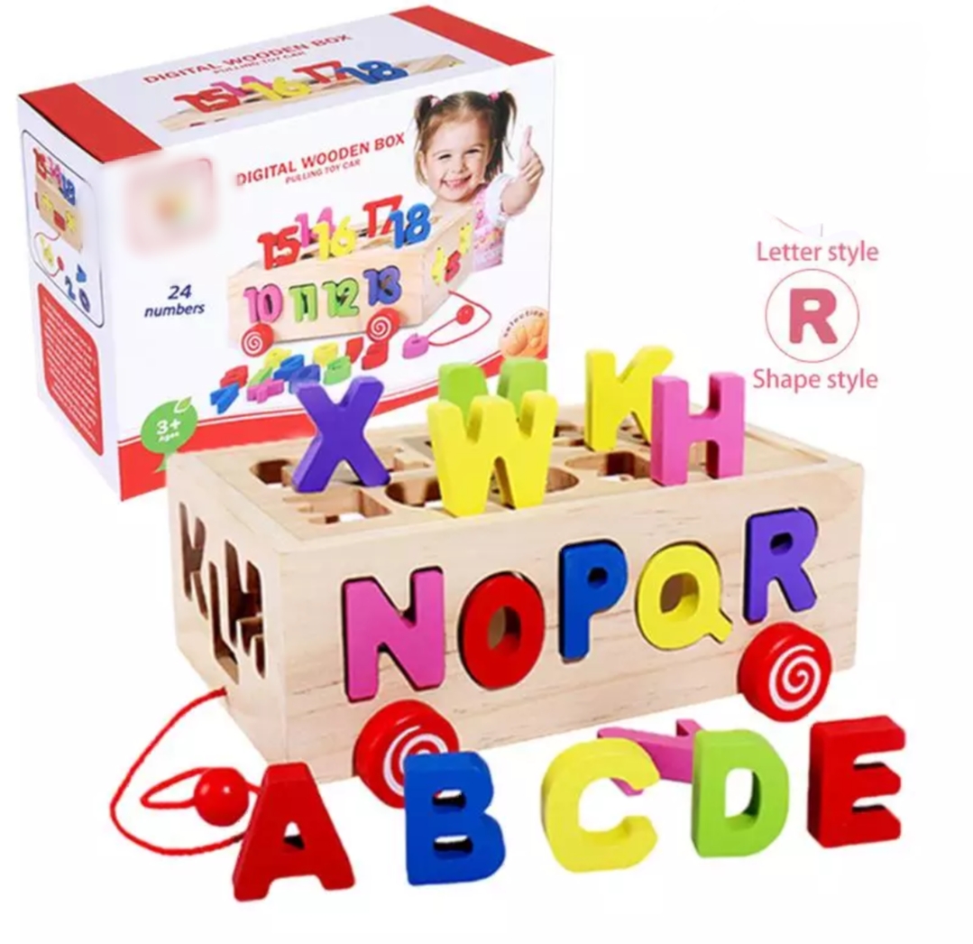 Letter wooden box sorter with pulling car.It is very easy to learn letters by sorting alphabets on its right places.it helps in hand eye coordination,brain development,sensory development,balanced intelligence,meta cognitive thinking,exploratory game,visual discrimination,ability of letters cognizance,operational ability.