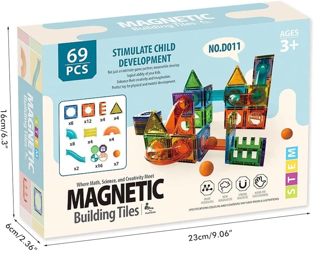The item is a set of magnetic building tiles designed for children ages 3+. It contains 69 pieces of various shapes and sizes. Key features and benefits include: