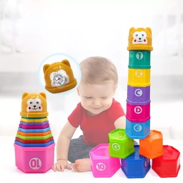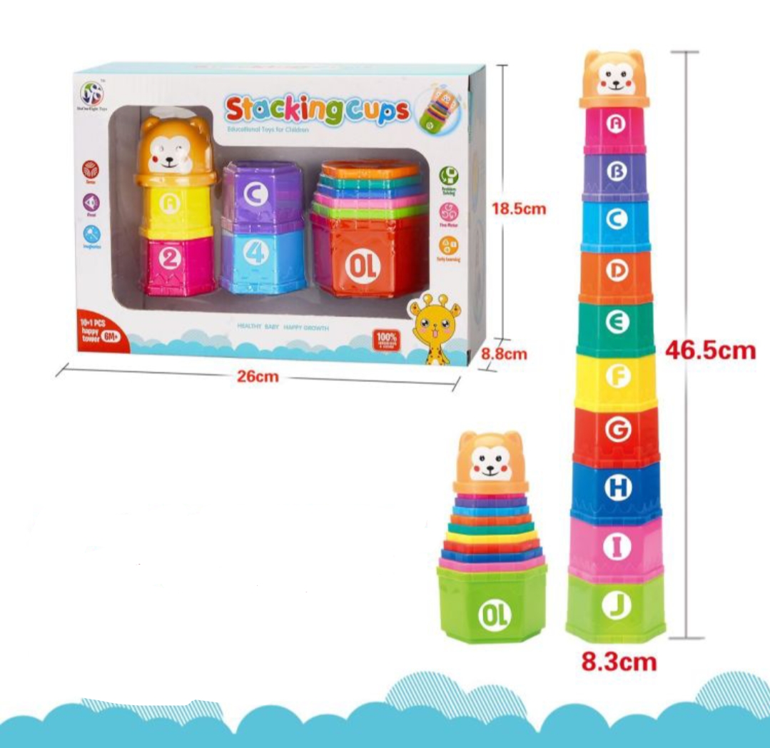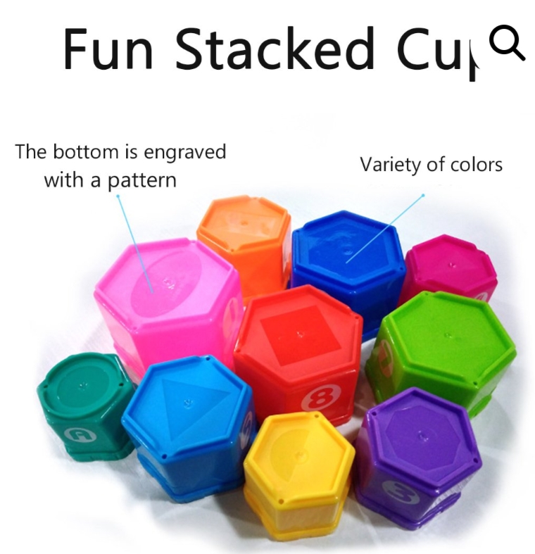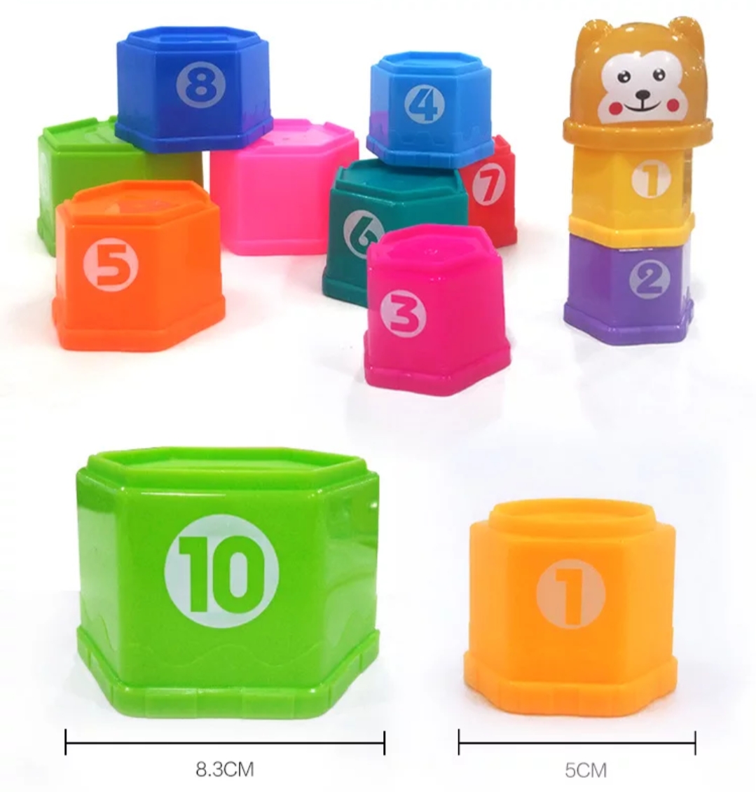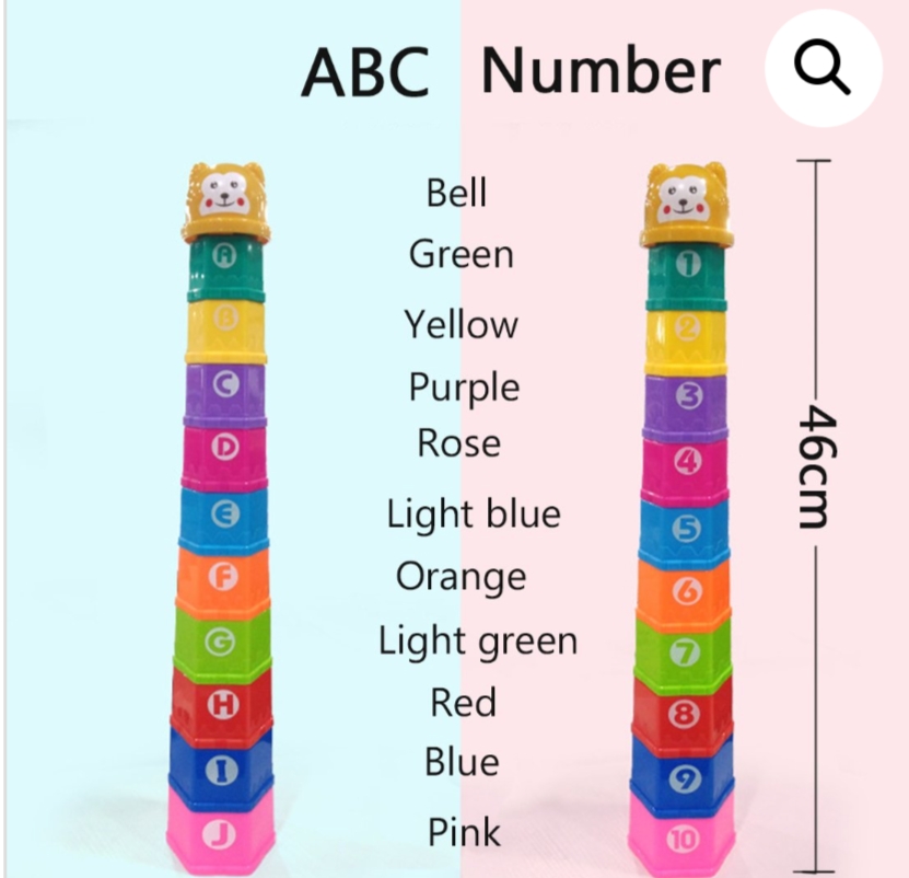 These stacking cups made of Friendly environment materials tested to be safe, meets toy safety standards. The early educational toy are marked with 1-10 numbers and letters, help the baby early familiar with numbers and letter, learn to count, train child’s responsiveness and logical abilities.