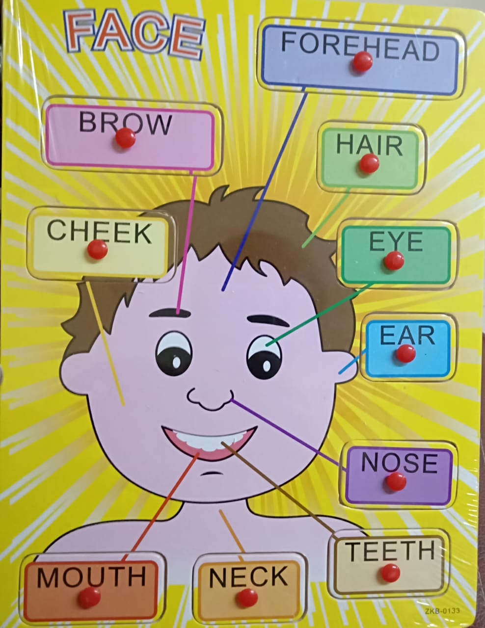Educational Face Parts Wood Peg Puzzle,Ideal for toddlers and kids learning about the main human Face parts Each Face part is labeled and contains a peg for kids to grasp easily