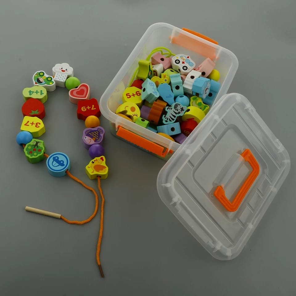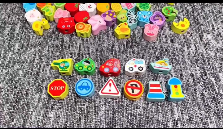 The wooden beads blocks can be threaded randomly, by color and shape i.e. by category or alphabetical order and numbers. It can be played at different level such as macro thinking by looking at the categories by grouping the blocks in same size and color.